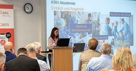 Melanie Gäbler, Referentin an der KRH Akademie stellte die KRH Akademie zu Beginn der Tagung vor und erntete begeisternden Applaus. In der Mittagszeit gab es für alle Gäste der Mitgliedshäuser Führungen durch das Skills Lab, auch die VR-Brille wurde fleißig ausprobiert. Der Dank von Dr. Thomas Menzel, Vorstandsvorsitzender AKG-Kliniken e.V. und Sprecher des Vorstandes, ging an die KRH Akademie für die hervorragende Organisation.
