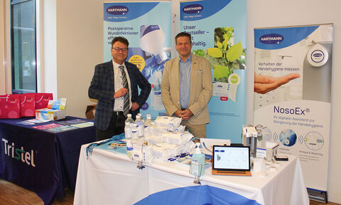 Neben den Vorträgen traf man sich vor Beginn der Veranstaltung und in der Pause bei einer kleinen, aber feinen Industrie-Ausstellung. Dies förderte den übergreifenden Netzwerkgedanken, die Teilnehmer*innen kamen auf lockere Weise ins Gespräch. Die Sponsoren B. Braun, Dr. Schumacher, Hartmann, Schülke, Solventum und Tristel präsentierten Hygieneprodukte, wie z. B. Hautantiseptik, Händedesinfektionsmittel, Tücher zur Desinfektion von kleinen, patientennahen Flächen und Tücher zur Desinfektion von Medical Devices.