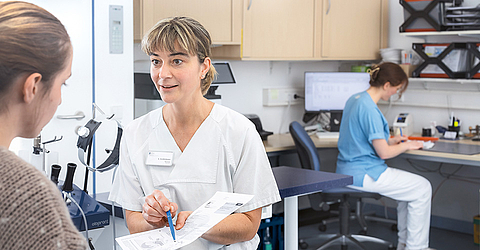 Sicherheit geben: Ärztin Konstanze Beddermann (Mitte) und die Medizinische Fachangestellte Lena Supplieth bereiten eine Patientin auf ihre OP vor.