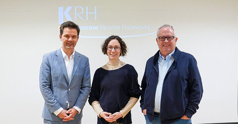 Die Abschlussveranstaltung des Mentoring-Programms zur Karriereförderung von Frauen am KRH Klinikum Region Hannover (v.l.): Regionspräsident Steffen Krach, Dr. Freya Markowis, Gleichstellungsbeauftragte des KRH und Michael Born, Geschäftsführer Personal KRH.