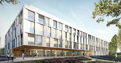 In dem Ersatzneubau werden acht Pflegestationen, ein zentraler OP-Bereich, ein Entbindungsbereich, Herzkatheter-Messplätze, eine interdisziplinäre Endoskopie und eine interdisziplinäre Elektivaufnahme entstehen.