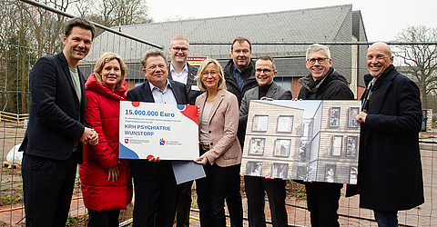 Strahlende Gesichter bei der Übergabe des Förderbescheids für den Neubau der Erwachsenenpsychiatrie an der KRH Psychiatrie Wunstorf (v. l.): Steffen Krach, Regionspräsident und Vorsitzender des KRH Aufsichtsrats, Rebecca Schamber (SPD), Bundestagsabgeordnete u. a. für die Stadt Wunstorf, Dr. Andreas Philippi, Niedersächsischer Minister für Soziales, Arbeit, Gesundheit und Gleichstellung, Leon Oppermann, Kaufmännischer Direktor KRH Psychiatrie Wunstorf, Barbara Schulte, KRH Geschäftsführerin Finanzen und Infrastruktur, MUDr. Peter Zahon, Ärztlicher Direktor KRH Psychiatrie Wunstorf, Bastian Flohr, Geschäftsführender Pflegedirektor KRH Psychiatrie Wunstorf, Carsten Piellusch, Bürgermeister der Stadt Wunstorf und Michael Borges, Betriebsratsvorsitzender der KRH Psychiatrie Wunstorf und stellvertretender Vorsitzender des Aufsichtsrats der KRH Psychiatrie. Credit: KRH Klinikum Region Hannover