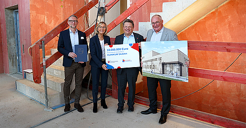 Übergabe des Förderbescheids für den Neubau der KRH Zentralapotheke, der am KRH Klinikum Siloah entsteht: Dr. Andreas Philippi, Niedersächsischer Minister für Soziales, Arbeit, Gesundheit und Gleichstellung (Zweiter von rechts) übergibt den Förderbescheid an (v. l.) Dr. Thomas Vorwerk, Leiter der KRH Zentralapotheke, Barbara Schulte, KRH Geschäftsführerin Finanzen und Infrastruktur, und Dr. Matthias Bracht, KRH Geschäftsführer Medizin.