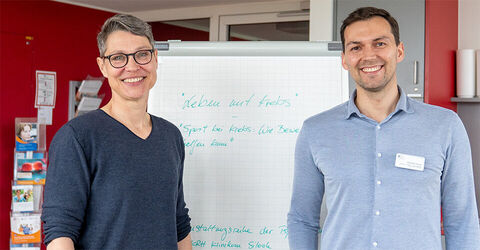 Meika Clausen, Mitglied der Drachenbootmannschaft Pink Dragonistas, und Alexander Hessel (rechts), Teamleiter der Psychoonkologie am KRH Klinikum Mitte, informieren Betroffene und Zugehörige über das Thema „Sport bei Krebs: Wie Bewegung helfen kann“