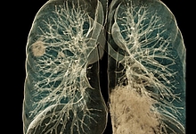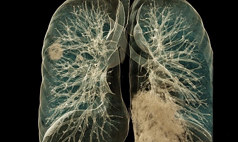 "Der Computertomograph zeigt uns das Innere des Körpers in Schichten. Bei dieser Aufnahme ist eine Vielzahl von Schnitten übereinandergerechnet und zu einem 3D-Bild verschmolzen. Mich erinnert die Darstellung der Lunge immer an von Wind und Wetter bearbeitete Bäume auf einem Bergkamm. Auf der rechten Bildseite unten und auf der linken Bildseite im oberen Bereich sieht man übrigens die Milchglastrübungen, die bei einer Infektion mit dem Coronavirus in der Lunge entstehen können." - Dr. Götz Voshage, Chefarzt des Instituts für Diagnostische und Interventionelle Radiologie in Gehrden und Neustadt (Copyright Foto: Siemens Healthcare GmbH)