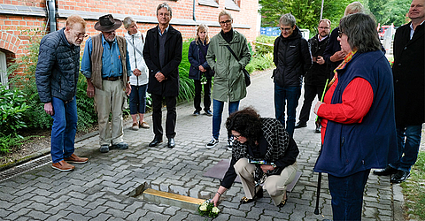 Gedenkt der Patientinnen und Patienten, die von Wunstorf aus deportiert wurden: Prof. Dr. Iris Tatjana Graef-Calliess, Ärztliche Direktorin der KRH Psychiatrie Wunstorf, legt Blumen ab. Mit dabei u. a.: Künstler Gunter Demnig (Zweiter von links), Andreas Tänzer, Vorsitzender des Fördervereins Psychiatriebewegt und ehemaliger Chefarzt der Klinik für Forensische Psychiatrie und Psychotherapie (Vierter von links), Maria Matzel, Vorsitzende Landesverband Verein Psychiatriebewegt (Zweite von rechts) und weitere Besucher*innen der Gedenkveranstaltung.