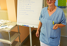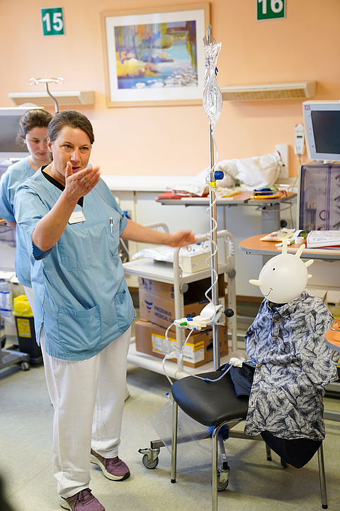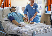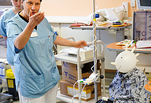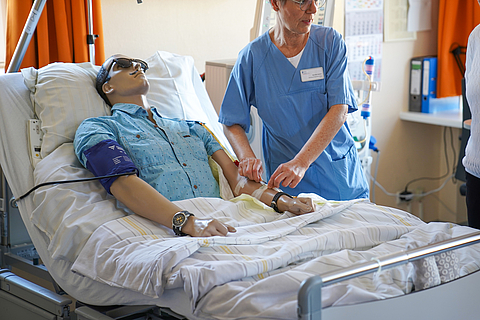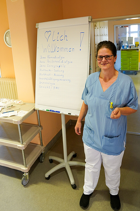 Expert*innen haben die Dialyseverfahren, Hämodialyse und Peritonealdialyse, an lebensechten Dummys vorgestellt. „Bei der Hämodialyse filtert ein Dialysegerät das Blut außerhalb des Körpers und führt es diesem anschließend wieder zu. Diese Art der sogenannten ‚Blutwäsche‘ findet in der Regel in einem ambulanten Zentrum an drei Tagen in der Woche statt. Die Hämodialyse wird mittels eines Katheters oder eines Shunts durchgeführt“, erklärt Kerstin Kaiser, Pflegefachkraft im Dialysezentrum im KRH Klinikum Lehrte.