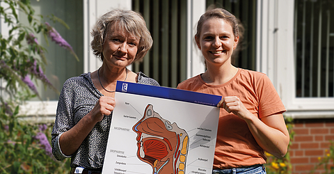 Logopädinnen Svenja Eberhardt und Martina Rohmann vor der KRH Geriatrie in Langenhagen.